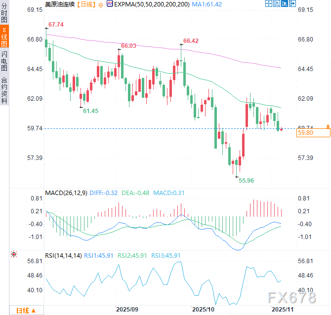周四(11月6日)美原油连续在经历三日连跌后小幅回升,目前上涨0.4%至每桶59.83美元附近,此前油价一度跌至近两周低点59.52美元/桶。然而由于库存大幅增加加剧供应过剩担忧,油价可能进一步下挫。
