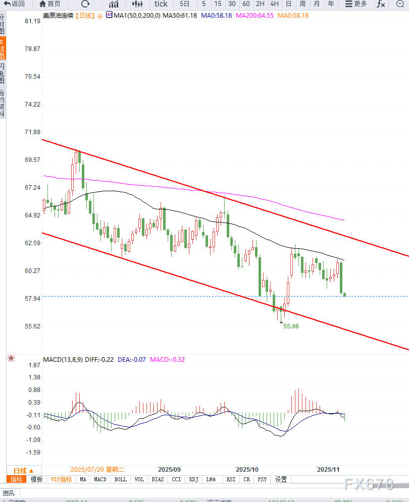 从日线图形来看,WTI价格目前位于58美元的关键支撑位附近。若该价位被有效跌破,下一目标支撑区间可能下探至56美元至55.50美元之间。