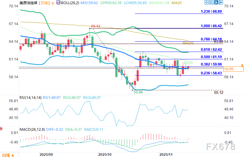 当前美原油连续处于多空博弈的区间震荡阶段,上方均线阻力较强,若无法有效突破 50 日均线(61.04 美元),大概率延续震荡偏空格局;若意外突破,则需关注 200 日均线(63.00 美元)的压制力度。下方需重点留意 58.43 美元(斐波那契 0.236 位)和 56.85 美元(布林带下轨)的支撑有效性。
