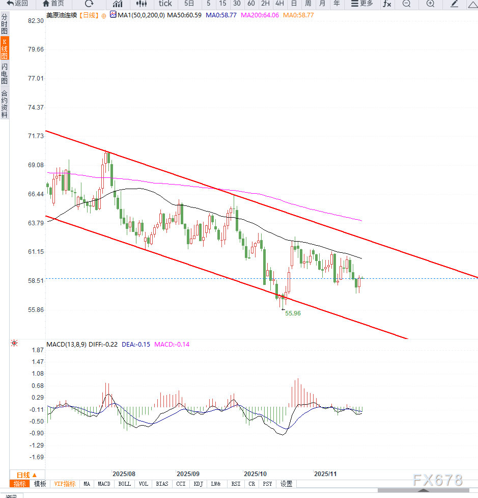 若价格持续受制于59.5美元上方压力带,油价可能重新回落至58美元附近;若出现放量突破,则短线有望迎来反弹修复。但在缺乏基本面支撑前,技术面仍倾向震荡偏弱格局。