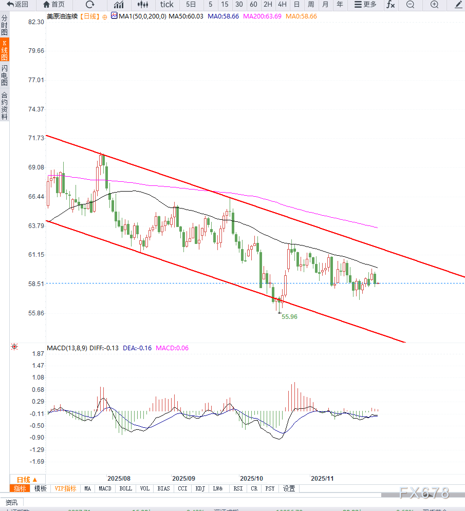 从WTI日线图走势来看,油价在跌破60美元关口后已明显跌穿短期均线支撑区,并触及近一个月震荡平台的下缘位置。近期连续阴线显示空头力量主导行情,MACD动能柱持续扩大在零轴下方,反映趋势延续弱势。
