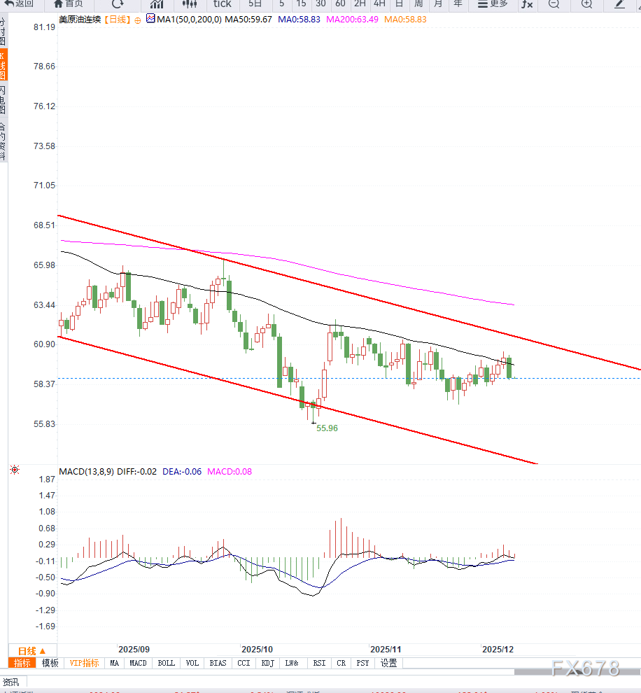 此外,布林带中轨附近的59-60美元区间成为多空争夺的关键点位,一旦日线收盘继续跌破中轨,下方可能重新测试57.5与56.8两个支撑区。整体来看,美原油目前处于高位震荡后的调整阶段,趋势方向尚需等待消息面与美联储政策落地后的进一步确认。