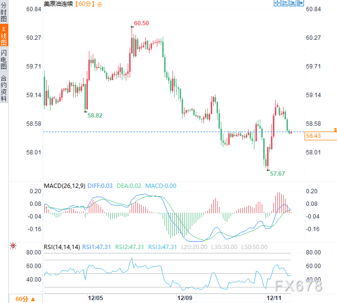 周四亚市时段,美原油价格先受地缘风险支撑走高,而后因美元走强而回落,现于58.43美元/桶附近震荡。