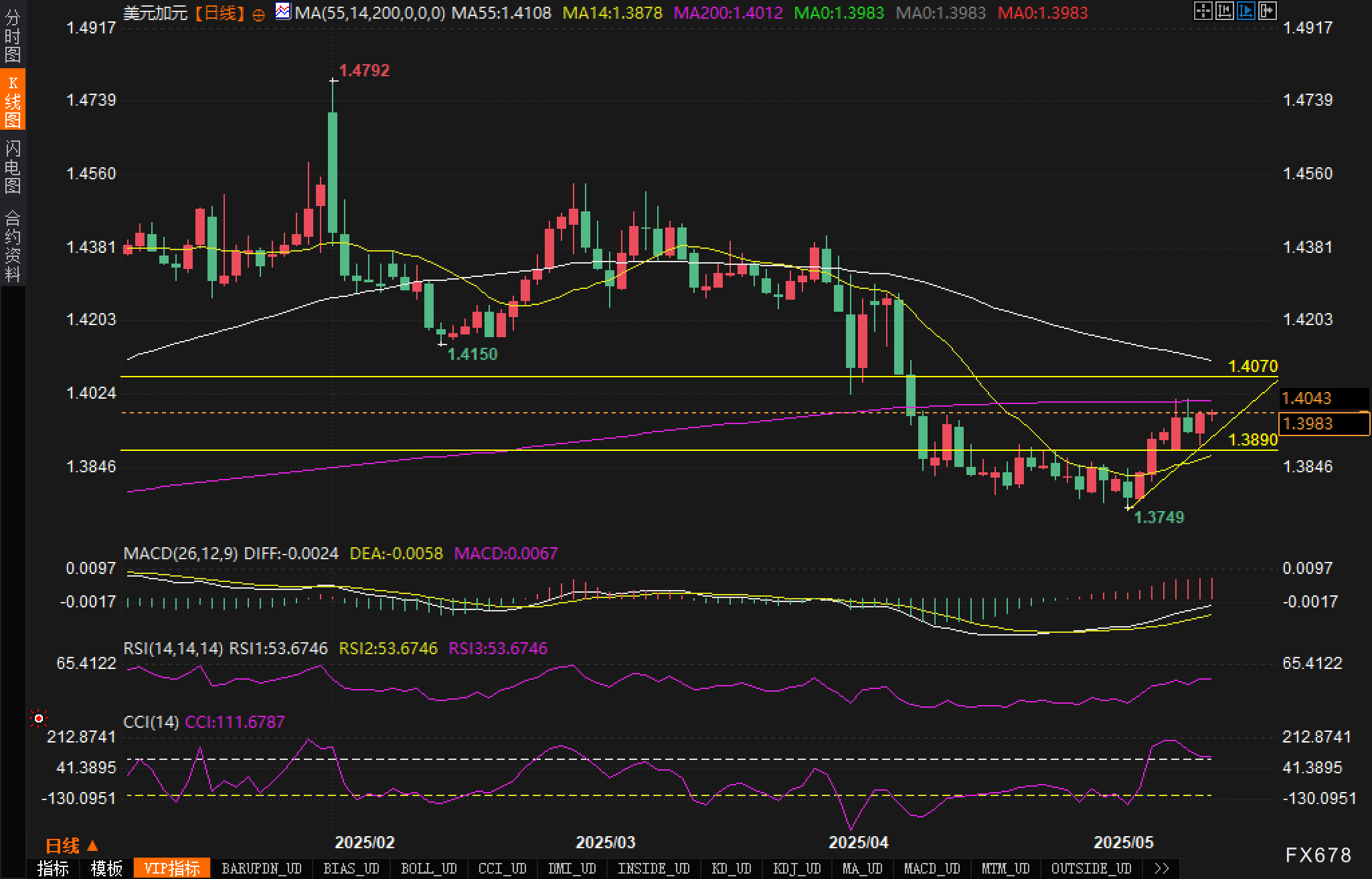 另一方面,若价格未能有效突破1.4000心理关口,并回落至1.3890支撑位下方,则可能引发更大规模回调至1.3750-1.3800区域。促成这一情景的可能因素有:油价企稳反弹提振加元;美国数据不及预期削弱美元;以及贸易紧张局势缓和改善风险情绪,减少美元作为避险货币的吸引力。从技术面看,若价格跌破MA14支撑,同时MACD形成死叉,将证实下行趋势的形成。
