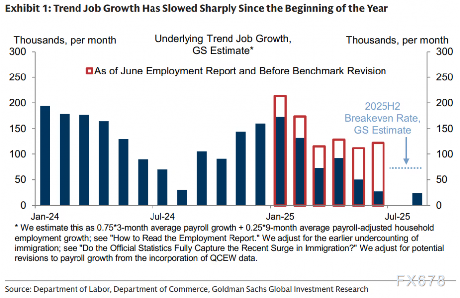 高盛经济学家本周系统阐述了就业增长快速萎缩的五大成因:移民流入放缓、政府招聘与资金缩减、人工智能技术应用普及、关税成本与贸易不确定性上升,以及宏观经济增长风险加剧。据其测算,当前潜在趋势就业增长已降至每月仅2.5万人,较1月份预测大幅减少约12.5万人。