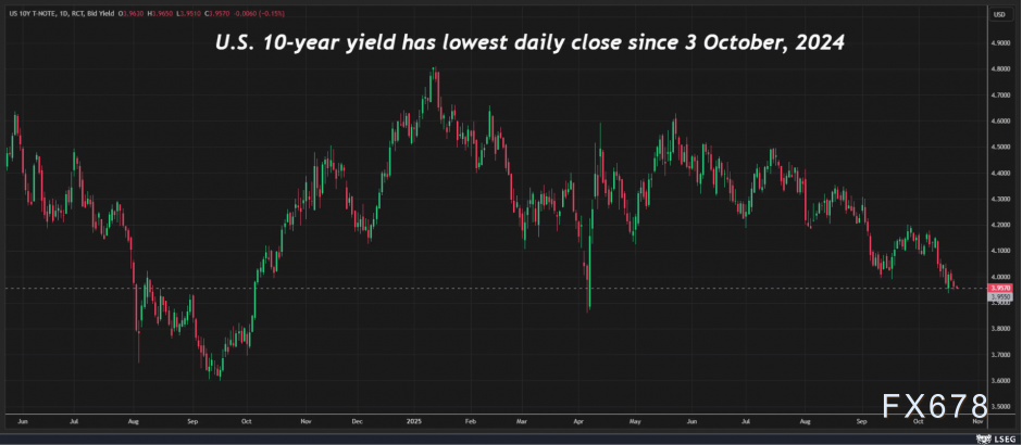 (图:美国10年期国债收益率创2024年10月3日以来最低收盘水平)